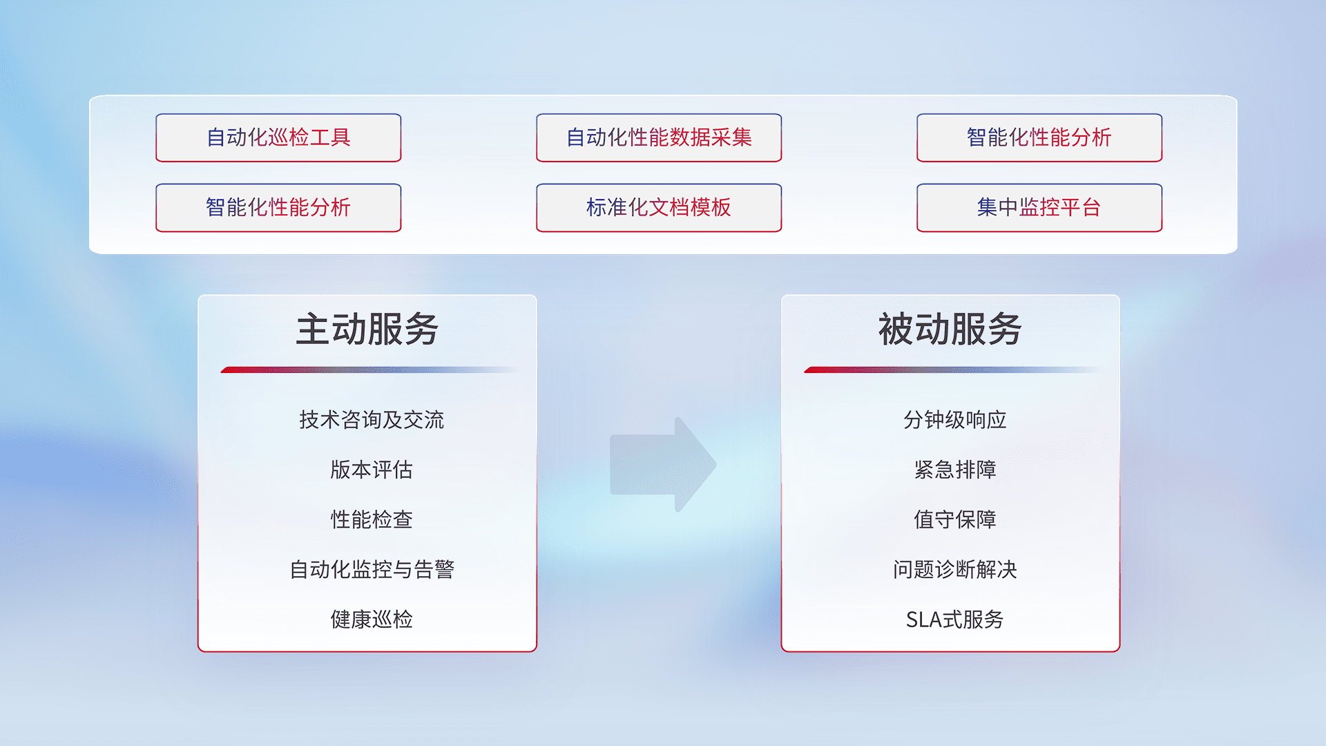 智能化工具和标准化文档,,,,保障服务质量,,提供主动服务(包含技术咨询、、版本评估、、、性能检查、、、、自动化监控与告警、、、、健康巡检)和被动服务包含(分钟级响应、、紧急排障、、、、值守保障、、、、问题诊断解决、、SLA服务)。。